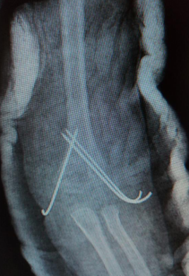 手術后圖片:僅有3個克氏針針孔,幾乎無疤痕形成,且克氏針外置,術后6周即可拔出克氏針,無需住院開刀取出。