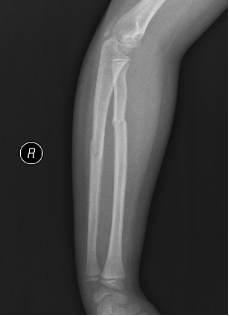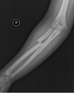 手術前X片:提示患兒尺橈骨干雙骨折,尺橈骨斷端有成角、短縮及移位