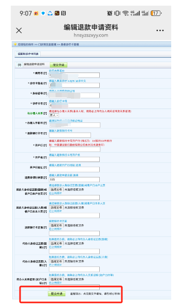 5.填寫患者本人聯(lián)系方式、銀行卡信息并上傳相關證件資料,如需代辦且收款的銀行卡為代辦人的卡,需上傳有效關系證明(戶口本或社區(qū)開具的關系證明)。填寫完整后提交申請,審核后退款將于15個工作日內到賬。
